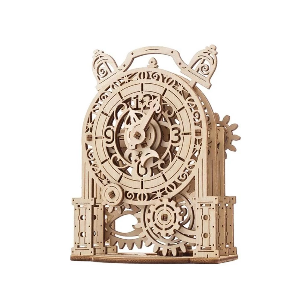 Az UGEARS Vintage ébresztőóra egy mutatós, fából készült modell, amely a régi mechanikus ébresztőórák világát idézi. Oldalsó fogaskerekeinek tekerésére a mutatók mozogni kezdenek, a kis harangok pedig jellegzetes hangot adnak ki. A számlapon megjelenő elemek, mint a nap vagy a növények, különleges hangulatot kölcsönöznek a dizájnnak.